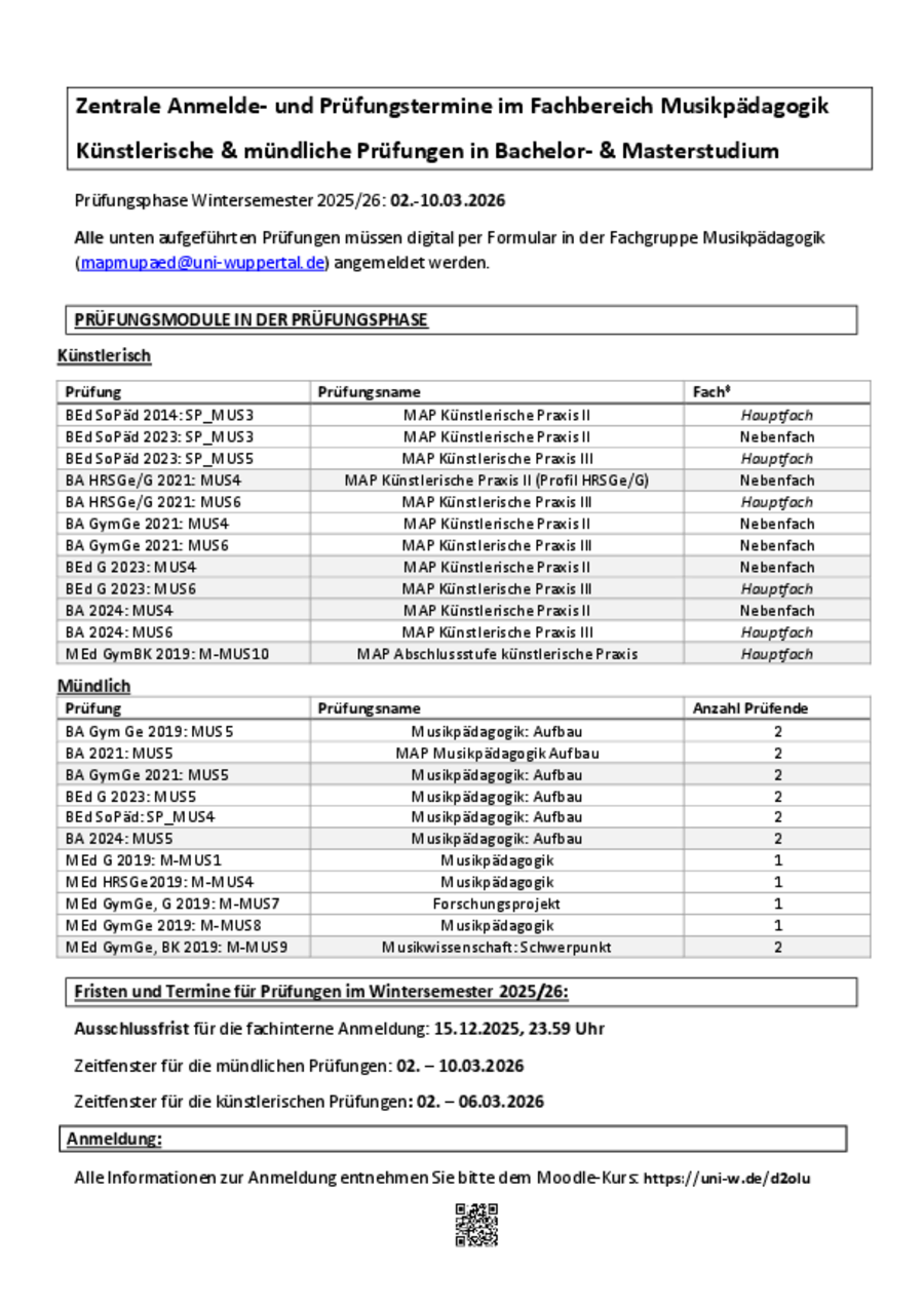 Anmelde- und Prüfungstermine in der Fachgruppe Musikpädagogik